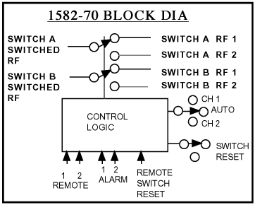 The 1582-70L provides AUTO or Manual latched relay switching between CH1 and CH2 RF signals. Alarm conditions on CH1 and CH2 are either a contact closure to ground or an open (selectable). The logic for switching can be selected to occur as follows:
