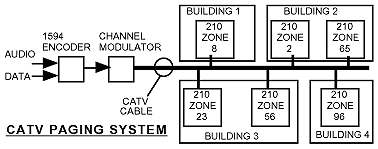 | The Series 210-01 receives the paging audio signal and a data control signal which determines if the paging message is intended for its location. The transmitted data determines if the audio is intended for this location as determined by the location code of the two BCD switches on the front panel. When the data matches the location code of this unit, it switches audio from an external audio source to the paging audio. A “Carrier Presence” LED , “Data Activity” LED, and “Power” LED indicates the operating status of the Series 210-01. Connectors are RCA Phono plug for external audio in and switched audio out (unbalanced), F connector for CATV in, and 2.1mm power connector. Power is provided by a wall mount power supply. | ||
