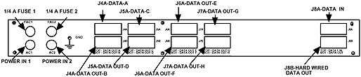 | The 1583-09 Data Splitter provides 9 RS232C outputs of the data signal (pin 2 of the DB9 connector). One of the outputs is a hard wired pass through of the input which can be used for very important functions or to further split the data. Dual power supplies provide redundant power to the 1583-09 with front panel LEDs indicating proper power supply operation. The unit is housed in a 1 3/4”, rack mount chassis and all data connectors are DB9, female. | ||