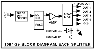 | Each unit contains two, nine way, 0.95 - 2 GHz, 0 dB gain splitters in a 1 Rack Unit chassis. Each splitter has a monitor connector on the front panel and four outputs on the back panel. Two individual 115 VAC input power supplies provide a diode OR’d + 22 VDC voltage to power the LNBs through DC power inserters. Each LNB power line is separately fused. A surge suppressor on each LNB input protects against high voltage transients. On the front panel, green LEDs indicate presence of +22 VDC at each LNB power supply output and DC voltage test points allow monitoring the LNB voltage with a voltmeter. | ||