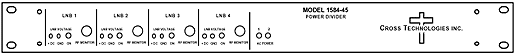 | Each unit contains four, five way, 0.95 - 2 GHz, 0 dB gain splitters in a 1 Rack Unit chassis. Each splitter has a monitor connector on the front panel and four outputs on the back panel. Two individual 115 VAC input power supplies provide a diode OR’d + 22 VDC voltage to power the LNBs through DC power inserters. Each LNB power line is separately fused. A surge suppressor on each LNB input protects against high voltage transients. On the front panel, green LEDs indicate presence of +22 VDC at each LNB power supply output and DC voltage test points allow monitoring the LNB voltage with a voltmeter. | ||