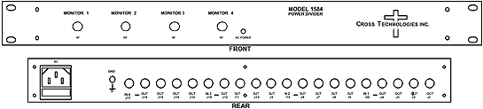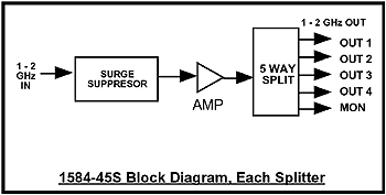 | The 1584 S-Series RF Splitters are just like the 1584 RF Splitters except that they do not provide any fused LNB power insertion and there is only one power supply (no redundancy). They are available in three models. The 1584-25S contains two five-way splitters, the 1584-29S contains two nine-way splitters, and the 1584-45S contains four five-way splitters. All splitters are 0.95 - 2 GHz, 0 dB gain splitters and each model is contained in a 1 Rack Unit chassis with a single 115 VAC power supply. Each splitter has a monitor connector on the front panel and four or eight outputs on the back panel. One 115 VAC input power supply provides + 15 VDC voltage to power the internal amplifiers. A surge suppressor on each input protects against high voltage transients. On the front panel, a green LED indicates the presence of voltage at the power supply output. | ||
