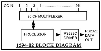 | The 1594-02 detects presence of a contact closure to ground on any of up to 96 inputs and provides a serial data stream which provides real time indication of each channel’s status (closure to ground or open). The internal processor sequentially polls up to 96 inputs by a 96 channel multiplexer and provides a continuous serial data stream containing a header code followed by 96 bits of information which are logic one if the corresponding input has a closure to ground and logic zero if the corresponding input is open. A check sum byte follows for error detection. The output data is 9600 baud, no parity, 8 bits, 1 stop at RS232C levels. A 90 - 260 VAC power supply provide DC power to the 1594-02. The unit is housed in a 1 3/4”, rack mount chassis. | ||