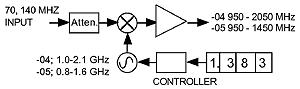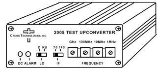 | The 2005 Test Upconverter converts a 70 or 140 MHz IF signal to 950 to 2050 MHz (-02) or 950 to 1450 (-03) in 1 MHz steps using a synthesized 1020 - 2120 MHz (-02) or 800 - 1600 MHz (-03) local oscillator (LO) signal. Four BCD switches control the synthesized LO and the output frequency. A green LED lights when DC power is applied. The mixer output is applied to the output amplifier providing a -25 dB or -5 dB gain. Power is provided by the LNB voltage from the receiver under test and connectors are BNC female for the 70 MHz input and F, female for the RF output. An external power supply (option -P) and rack mounting (option -R) is available. | ||