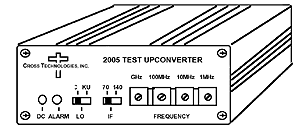 | The 2005 Test Upconverter converts a 70 or 140 MHz IF signal to 950 to 2050 MHz (-02) or 950 to 1450 (-03) in 1 MHz steps using a synthesized 1020 - 2120 MHz (-02) or 800 - 1600 MHz (-03) local oscillator (LO) signal. Four BCD switches control the synthesized LO and the output frequency. A green LED lights when DC power is applied. The mixer output is applied to the output attenuator providing a -30dB or -10dB gain. Power is provided by the LNB voltage from the receiver under test and connectors are BNC female for the 70 MHz input and F, female for the RF output. An external power supply (option -P) and rack mounting (option -R) is available | ||