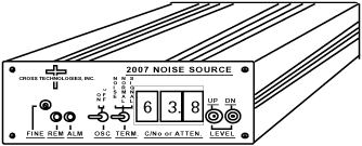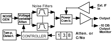| Broad band noise goes to precision attenuators controlled by front panel “up” and “down” pushbutton switches via the microprocessor controller. The front panel display shows C/No or attenuation of the noise from a 50 dB- Hz C/No level calibrated for a -20.0 dBm carrier level. Bandpass filters are selected with on board jumpers to band limit the noise at 70 MHz. The 2007 has a front panel red LED that lights if the ambient temperature is outside the +15 to +40 C calibrated temperature range. A yellow LED on the front panel indicates if in remote operation. | ||