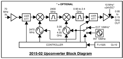 | The 2015 L-band Upconverter converts 70 ± 18 MHz to 950 to 2150 MHz (2015-02) or 950 to 1525 MHz (2015-03) in 1 MHz steps with low group delay and flat frequency response. Synthesized local oscillators (LO) provide frequency selection. Multi-function push button switches select the RF frequency, gain, and other parameters. Front panel LEDs provide indication of DC power (green), PLL alarm (red), remote operation (yellow) or the TX carrier is muted (red). Variable attenuators for the IF input and output provide a gain range of -10 to +30 dB as adjusted by the front panel multi-function push-button switches. Remote operation allows selection of frequency and gain. Parameter selection and frequency and gain settings appear on the LCD display. Connectors are BNC female for IF and the optional external reference input and output, and Type F female for the RF output. SSPB +24 VDC, 2.5 Amps and 10 MHz reference can be inserted on the RF line as added options. The 10 MHz option also includes a 10 MHz output connector which contains either the internal or external 10 MHz reference signal. A high stability (±0.01ppm) option is also available. The unit is powered by a 90-260 VAC power supply, and housed in a 1 3/4” X 19 “ X 16” rack mount chassis. | ||