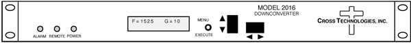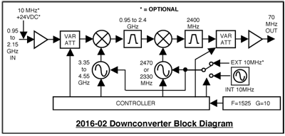 | The 2016 L-band Downconverter converts 950 to 2150 MHz (2016-02) or 950 to 1525 MHz (2016-03) in 1 MHz steps to 70 ± 18 MHz with low group delay and flat frequency response. Synthesized local oscillators (LO) provide frequency selection. Multi-function push button switches select the RF frequency, gain, and other parameters. Front panel LEDs provide indication of DC power (green), PLL alarm (red), and remote operation (yellow). Gain is adjustable manually over a 0 to +50 dB range as adjusted by the front panel multi-function push-button switches. Remote operation allows selection of frequency and gain. Parameter selection and frequency and gain settings appear on the LCD display. Connectors are BNC female for IF output and the optional external reference input and output, and Type F female for the RF input. LNB +24 VDC, 0.4 Amps and 10 MHz reference can be inserted on the RF line as added options. The 10 MHz option also includes a 10 MHz output connector, which contains either the internal or external 10 MHz reference signal. A high stability (±0.01ppm) option is also available. The unit is powered by a 90-260 VAC power supply, and housed in a 1 3/4” X 19 “ X 16” rack mount chassis. | ||