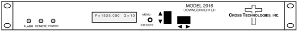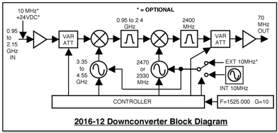 The 2016-12 L-band Downconverter converts 950 to 2150 MHz in 1 kHz, 10 kHz, or 125 kHz steps (user selectable) to 70 ± 18 MHz with low group delay and flat frequency response. Synthesized local oscillators (LO) provide very low phase noise and ±0.01 ppm stability frequency selection. Multi-function push button switches select the RF frequency, gain, and other parameters. Front panel LEDs provide indication of DC power (green), PLL alarm (red), and remote operation (yellow). Gain is adjustable manually over a 0 to +50 dB range as adjusted by the front panel multi-function push-button switches. Remote operation allows selection of frequency and gain. Parameter selection and frequency and gain settings appear on the LCD display. Connectors are BNC female for IF output and the optional external reference input and output, and Type F female for the RF input. LNB +24 VDC, 0.4 Amps and 10 MHz reference can be inserted on the RF line as added options. The 10 MHz option also includes a 10 MHz output connector, which contains either the internal or external 10 MHz reference signal. The unit is powered by a 90-260 VAC power supply, and housed in a 1 3/4” X 19 “ X 16” rack mount chassis. |