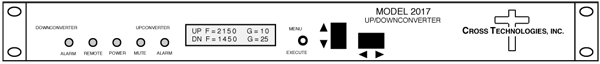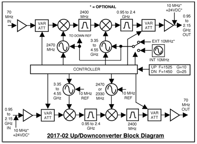 | The 2017-02 L-band Up/Downconverter converts 70 MHz to 950-2150 MHz (Up) and 950-2150 MHz to 70 MHz (Down) in 1 MHz steps with low group delay and flat frequency response. Synthesized local oscillators (LO) provide frequency selection. Multi-function push button switches select the RF frequency, gain, and other parameters. Front panel LEDs provide indication of DC power (green), PLL alarm for up and downconverters (red), remote operation (yellow), and Upconverter mute (yellow). Gain is manually controlled over a –10 to +30 dB range for the upconverter and over a 0 to +50 dB range for the downconverter as adjusted by the front panel multi-function push-button switches. Remote operation allows selection of frequency and gain. Parameter selection and frequency and gain settings appear on the LCD display. Connectors are BNC female for IF and the optional external reference input and output, and Type F female for RF. LNB or SSPB +24 VDC and 10 MHz reference can be inserted on the RF lines as added options. A high stability (±0.01ppm) option is also available. The unit is powered by a 90-260 VAC power supply and housed in a 1.75” X 19“ X 16” rack mount chassis. | ||