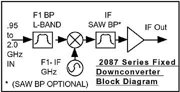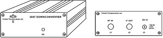 | The 2087 Series Fixed Downconverter converts an L-band signal to IF with no spectrum inversion, low group delay, and flat frequency response. The L-band RF input is mixed with a synthesized local oscillator (LO) signal to IF. The LO frequency is fixed. A green front panel LED lights when DC power is applied. Connectors are Type F for the RF input and BNC female for IF output. The 2087S series includes a bandwidth determining SAW filter. Power is provided by a 120 ± 10% VAC, 60Hz, wall mount power supply. The 2087 Series Fixed Downconverter is housed in an 4.7” wide X 1.75” high X 12.5” deep aluminum chassis. The 2087 can be mounted on an 1 3/4” X 19 “ rack mount panel (option -R). | ||