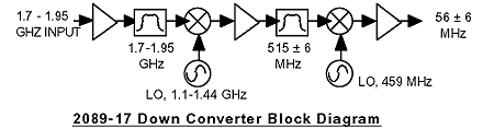 | The 2089-17 Agile Downconverter converts a 1700 to 1950 MHz signal to 515 MHz in 1MHz steps with a low side 1185 to 1435 MHz first LO and then to 56 ± 6 MHz with low side 459 MHz LO. Up and down tune push buttons control the output frequency displayed on the LED indicators . Frequency selection can be remotely selected via a RS232C data input. A red LED PLL alarm lights when the PLL is unlocked and goes to an open drain FET output. A Yellow LED indicates remote operation. | ||