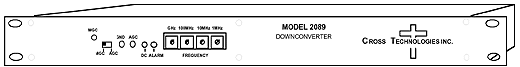| The Series 2089-24A Downconverter converts 2.0 - 2.4 GHz IF signal to a 70 MHz IF with no spectrum inversion, low group delay, and flat frequency response. The 2.0 - 2.4 GHz input is mixed with synthesized local oscillator (LO) signals, first to 600 MHz and finally to 70 MHz. The frequency is selected using four front panel BCD switches, and is selectable in 1 MHz increments. The reference oscillator is a 25 MHz internal oscillator. Front panel LEDs light when DC power is applied (green) or when a PLL alarm occurs (red). Gain is selectable to be either manually adjustable (MGC) or automatically adjusted (AGC). Front panel test points allow for monitoring the AGC voltage (and corresponding AGC gain) when in AGC mode, and a front panel potentiometer allows for gain adjustment when in MGC mode. The MGC gain is adjustable from 20 to 50 dB. Connectors are Type N female for the RF input and BNC female for the IF output. A terminal strip is mounted on the rear panel and provides a closure to ground when the PLL is out of lock. The 2089-24A Downconverter is housed in a 1 3/4” X 19“ X 14“ deep rack mount chassis. | ||