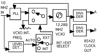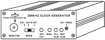 | The Model 2099-42 Clock Generator provides two RS422 clock signals selectable from 256, 192, 128, 96 or 64 kHz and generated from a 12.288 MHz VCXO locked to an external 10 MHz reference. Level detection circuitry provides an alarm signal if the external 10 MHz signal is removed and automatic switching tunes the VCXO in the PLL to 12.28800 MHz until the 10 MHz clock is restored. LEDs indicate PLL and Level alarms, Manual operation, and selection of internal or external (lock to 10 MHz) control of the VCXO. A front panel switch manually selects internal or external (lock to 10 MHz) control of the VCXO. Diodes on the DC inputs allow operation from redundant power supplies. An open collector indicates Manual operation and relay contacts indicate a major alarm due to loss of PLL lock or 10 MHz reference.The unit is housed in an aluminum extrusion chassis and can be mounted on an 1 3/4”, rack panel (Option -R). A wall power supply provides DC power to the 2099-42. | ||