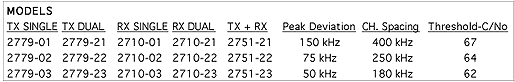 crystal controlled, factory set approximately 2.4 X (peak deviation + top audio freq) ± 50kHz to ± 325kHz, factory set BNC, female, subcarrier in/out; terminal strip, audio and alarm 115 VAC, 60Hz, < 20W 1.75"H X 19"W X 15"D, each |