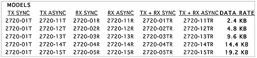 | The 2720 is an FSK subcarrier above video data transmission system with factory set frequencies from 4.5 MHz to9.0 MHz. Data is synch or asynch (factory set) and the interface format can be set to RS-422 or RS-423 (RS-232 compatible) by changing on board jumpers. Connection to video is via a high impedance resistor which does not load the video signal even if power is lost. | ||
