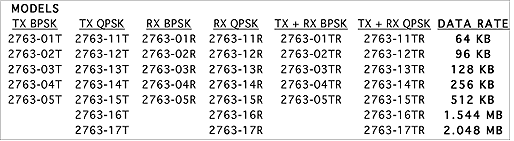BPSK or QPSK 5.4 to 8.4 MHz, crystal controlled, factory set 64, 96, 128, 256, 512 kB/s (BPSK or QPSK); 1.544, 2.048 Mb/s (QPSK only) QPSK, 0.7 X Data Rate; BPSK, 1.4 X Data Rate |