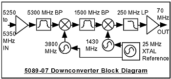 | The Series 5089 5 GHz Downconverters convert 5 GHz to IF with no spectrum inversion, high linearity, good phase noise, flat frequency response, and 1 MHz tuning steps. For the 5089-07, the 5.30 GHz input is mixed with synthesized local oscillator (LO) signals, first to 1500 MHz and finally to 70 MHz IF. The 5089-17 has a 170 MHz IF output and 5.725 to 5.825 GHz input frequency. Other frequencies can be provided. Front panel LEDs indicate DC power is applied (green) and if a PLL alarm occurs (red). The gain is set at 10 dB . Connectors are type N female for the RF input and type F female for the IF output. The 5089 is housed in an 1 3/4” X 19“ X 14“ deep rack mount chassis. | ||