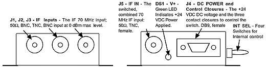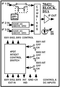The 70421 Switch provides internal or external switching of any or all of three 70 MHz IF inputs, combining, and amplification to provide a 0 dB gain of the output signal. In the EXTERNAL mode, grounding a switch control input allows the corresponding IF signal to pass through. When switched to INTERNAL, SPDT toggle switches control the IF switches. A green LED shows that DC power is applied. The female IF connectors are 2-BNC and 1-TNC for inputs and TNC for the output. The Control and DC Input connector is DB9, female. The unit is in a 1.2”high X 3.3” |